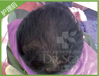 斑秃,精神压力大,在右耳后的位置,像鸡蛋大小。顾客是一 名脑力劳动者,建筑预算,平时很忙。出现斑秃,通过几个月 的管理,效果很棒。