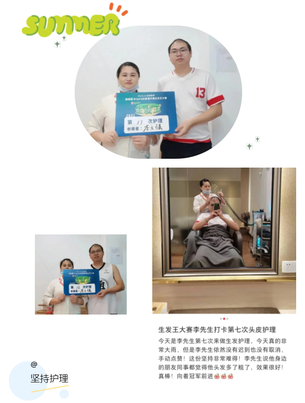 李先生参赛两个月来的护理阶段性效果,店员们的感觉也很明显,南艳护理师说,第一次李先生过来护理时只要一碰他的头,基本满手都是掉的细碎发,现在洗的时候包括用净化按摩梳的时候掉发很少了。看来头皮环境确实改善不少啊!